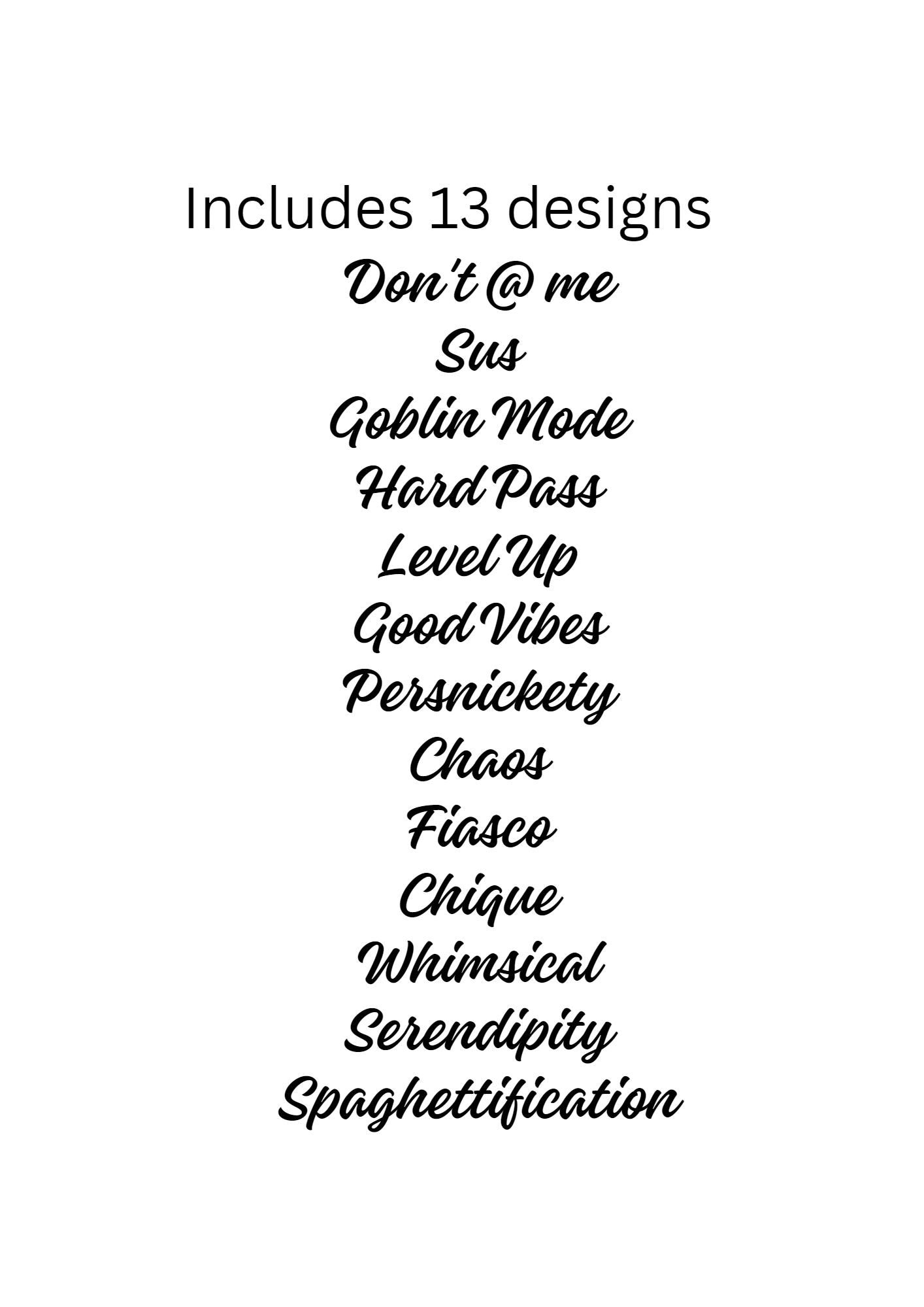 - 13 individual word definition designs (12 + 1 free) and available as 3 different dimensions: